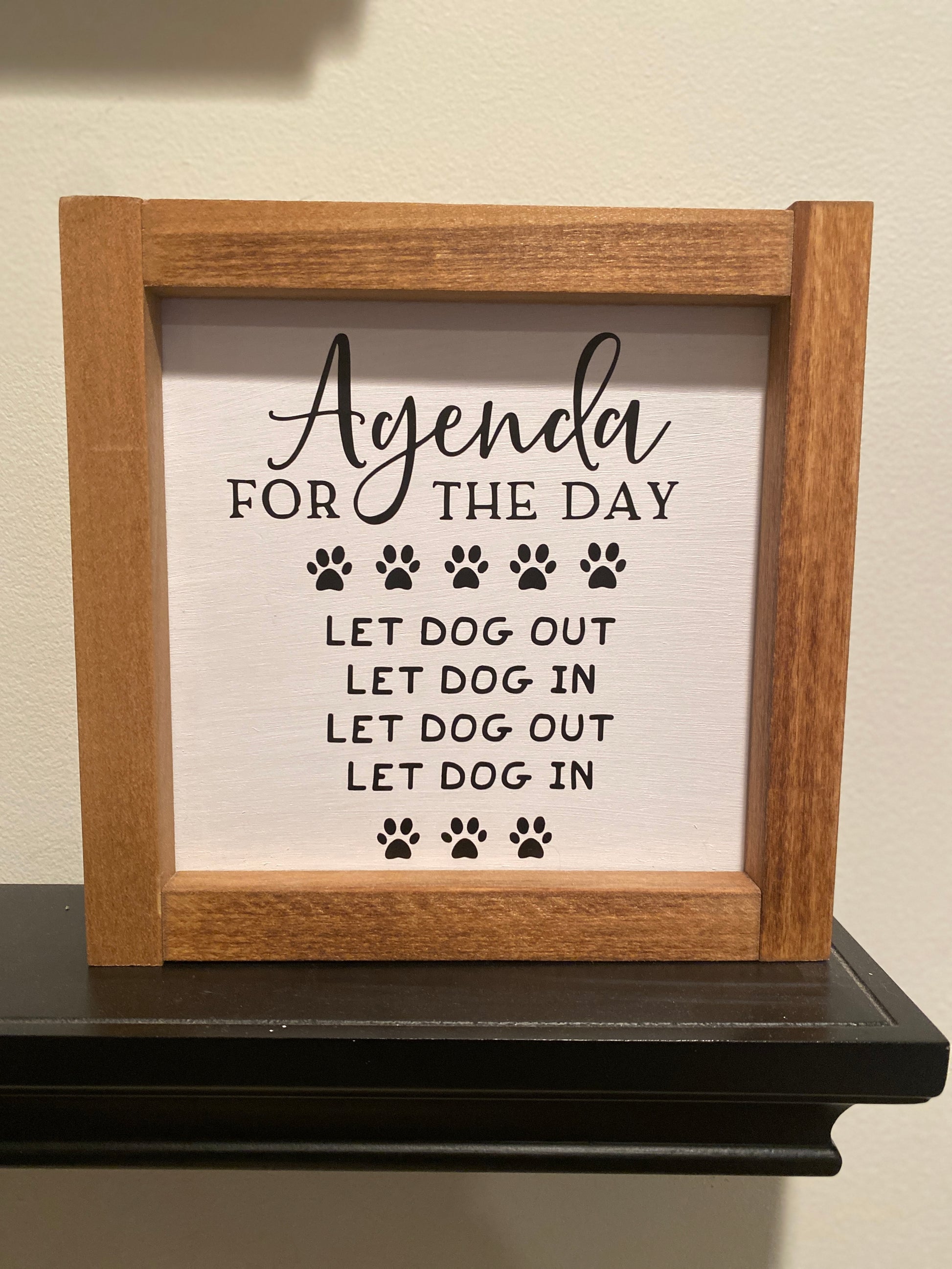 White backed sign with black lettering that says "Agenda for the Day: Let dog out. Let dog in. Let dog out. Let dog in."