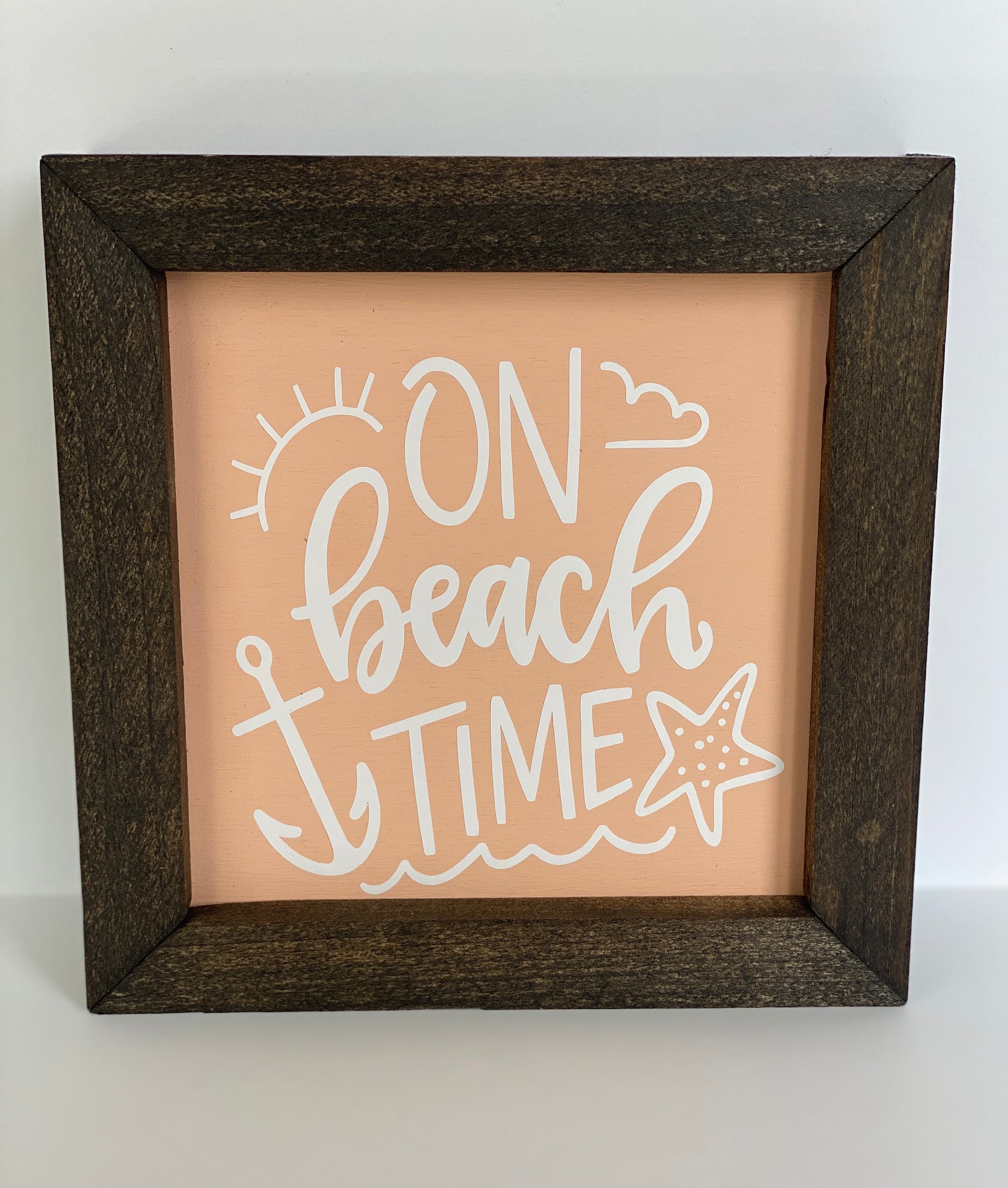 6x6" sized sign with coral painted birch backing and stained sides. Backing attached to hang.