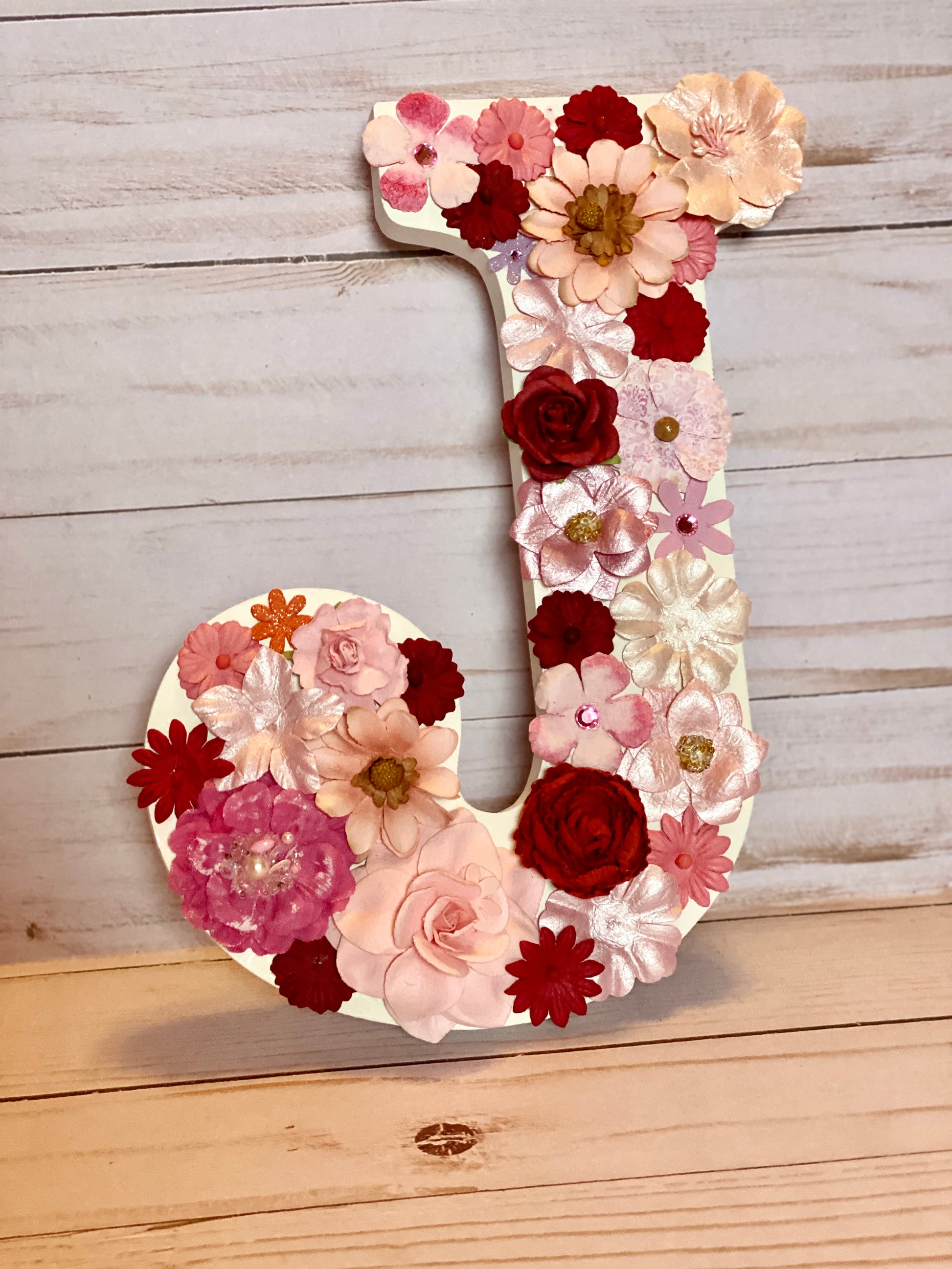 White letter "J" with varying pink and dark red flowers covered on it. There is a spot on the back for hanging. 9 inches in height and 7 inches wide.