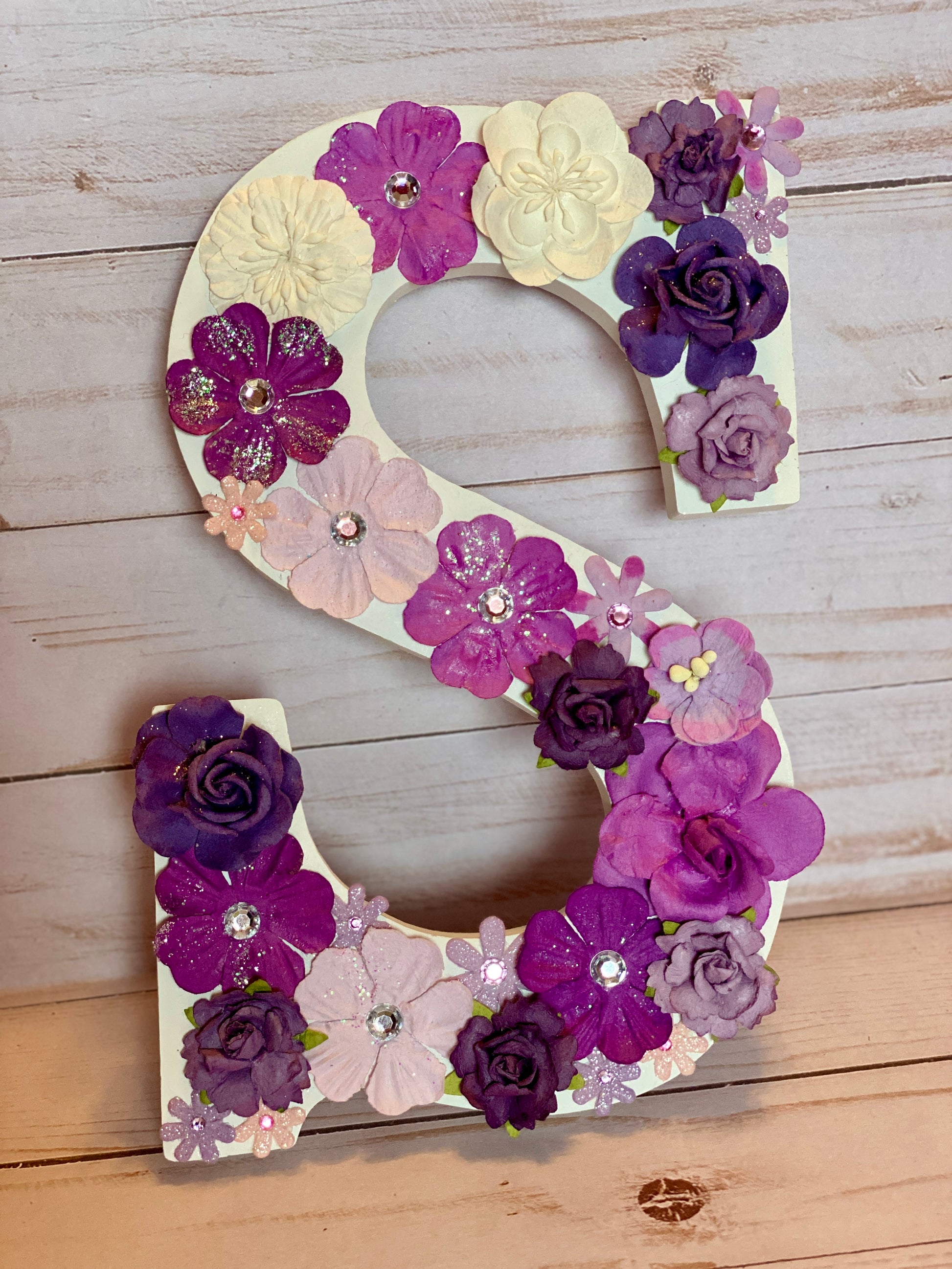 White letter "S" with varying purple and white flowers covered on it. There is a spot on the back for hanging. 9 inches in height and 7 inches wide.